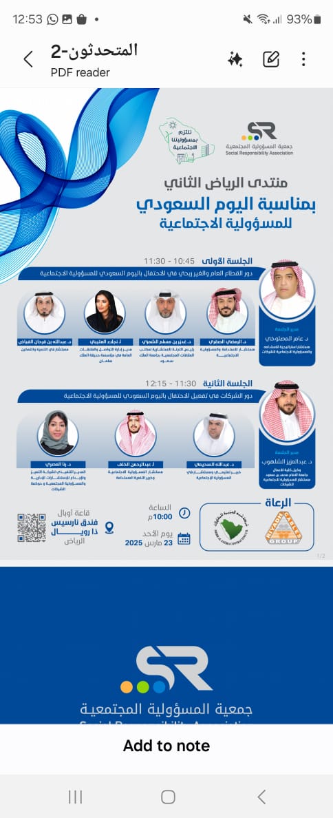 تنطلق البوم الأحد الساعة العاشرة مساء في قاعة اوبال بفندق نارسيس ذا رويال بالرياض فعاليات منتدى الرياض الثاني للمسؤولية الاجتماعية الذي تنظمه جمعية المسؤولية المجتمعية ضمن فعاليات الإحتفال باليوم السعودي للمسؤولية الاجتماعية المناسبة الوطنية السنوية التي تقام في 23 مارس من كل عام بعد صدور الموافقة الكريمة بتاريخ 22 نوفمبر 2022 بهدف تعزيز الوعي بدور المسؤولية الاجتماعية في التنمية المستدامة ودعم الجهود التي تسهم في تحقيق مستهدفات رؤية المملكة المستقبلية الطموحة 2030