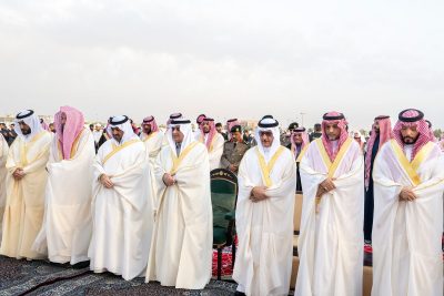 أدى صاحب السمو الملكي الأمير فهد بن سلطان بن عبدالعزيز أمير منطقة تبوك، وصاحب السمو الملكي الأمير خالد بن سعود بن عبدالله الفيصل بن عبدالعزيز نائب أمير منطقة تبوك وجموع المصلين بمنطقة تبوك ، اليوم ، صلاة عيد الفطر في مصلى العيدين بمدينة تبوك، وأم المصلين إمام وخطيب جامع الملك فهد بتبوك الشيخ سعود بن محمد العنزي، الذي استهل خطبته بحمد الله والثناء عليه، مهنئاً الجميع بعيد الفطر المبارك، وبإتمام صيام شهر رمضان وقيامه.