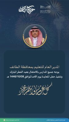وأثنى الدكتور “الغامدي” على الجهود المبذولة والمثمرة من قِبَل مديري ومديرات المدارس والهيئتين التعليمية والإدارية خلال الفصل الدراسي الأول والثاني،والثالث وتهيئة المدارس لاستقبال الطلاب والطالبات وتنفيذ برنامج المعايدة في جميع المدارس يوم الأحد 08 شوال 1446 وفق الإطار المرسل للمدارس على أن يتم مشاركة جميع الطلبة ومنسوبي المدارس في الاحتفال .