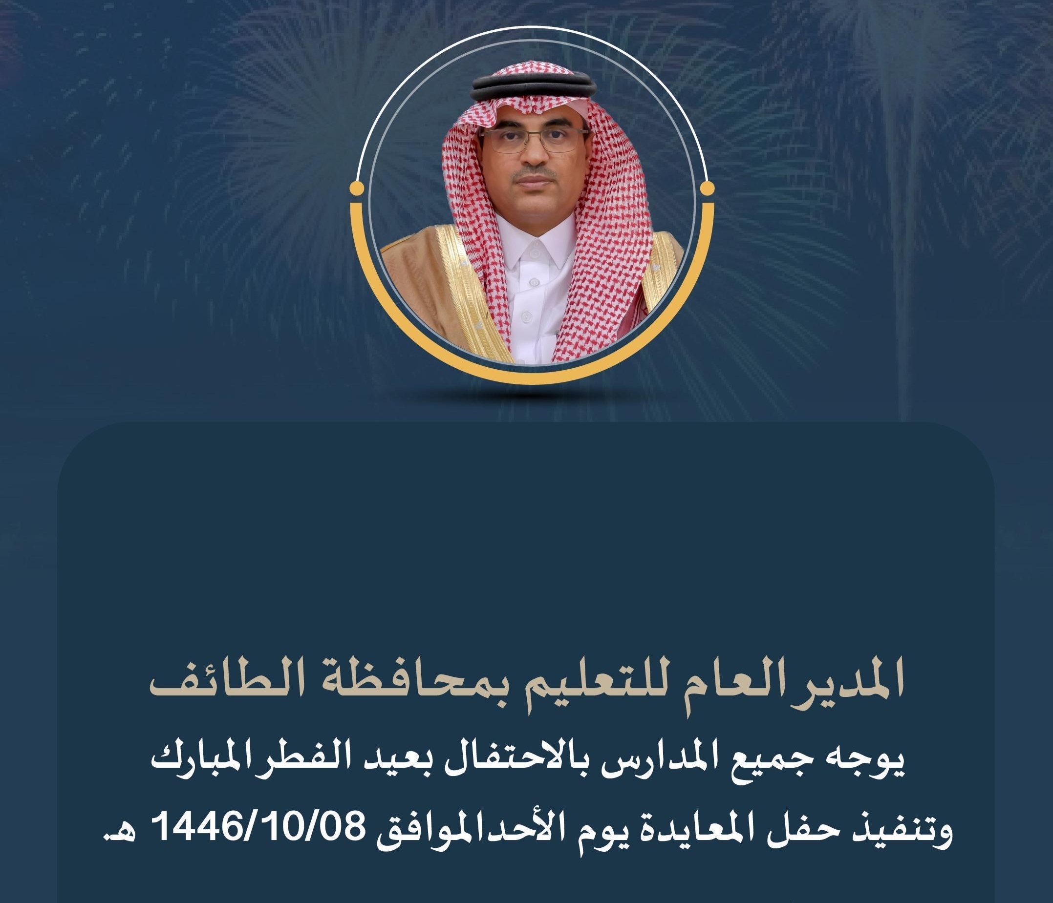 يحتفل أكثر من ربع مليون طالب وطالبة في 1700 مدرسة في الإدارة العامة للتعليم بالطائف غداً الأحد 8 شوال 1446هـ بعيد الفطر المبارك بمشاركة الطلبة ومنسوبيها بفعاليات متنوعة وذلك بهدف نشر البهجة والألفة والسرور بين الطلبة فرحاً بعيد الفطر السعيد، وإبراز مظاهر الاحتفال بالعيد السعيد، وكذلك تقوية العلاقات الاجتماعيّة، بالإضافة إلى التهيئة والاستعداد لإكمال الفصل الدراسي الثالث، والحرص على نشر أجواء من الراحة والطمأنينة في نفوس الطلبة للعودة بنشاط وهمة عالية .