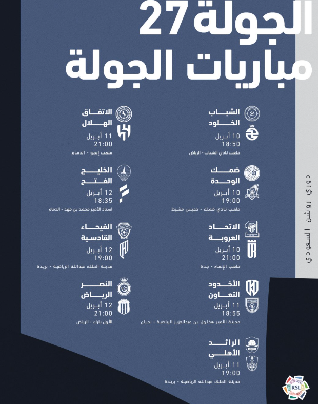 تُستأنف منافسات الدوري السعودي للمحترفين “دوري روشن” لموسم 2024-2025 مع انطلاق الجولة السابعة والعشرين, إذ يسعى كل فريق لتعزيز موقعه في جدول الترتيب، سواء في صراع الصدارة أو الهروب من مراكز الهبوط.