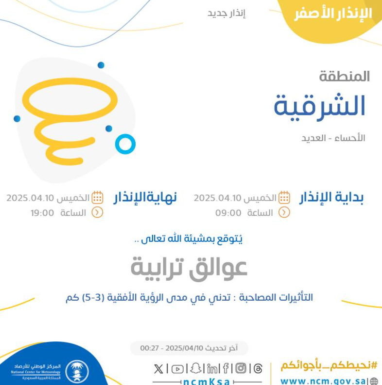 توقّع المركز الوطني للأرصاد استمرار تأثير الرياح النشطة المثيرة للأتربة والغبار على أجزاء من مناطق المملكة، خلال الأيام القادمة.