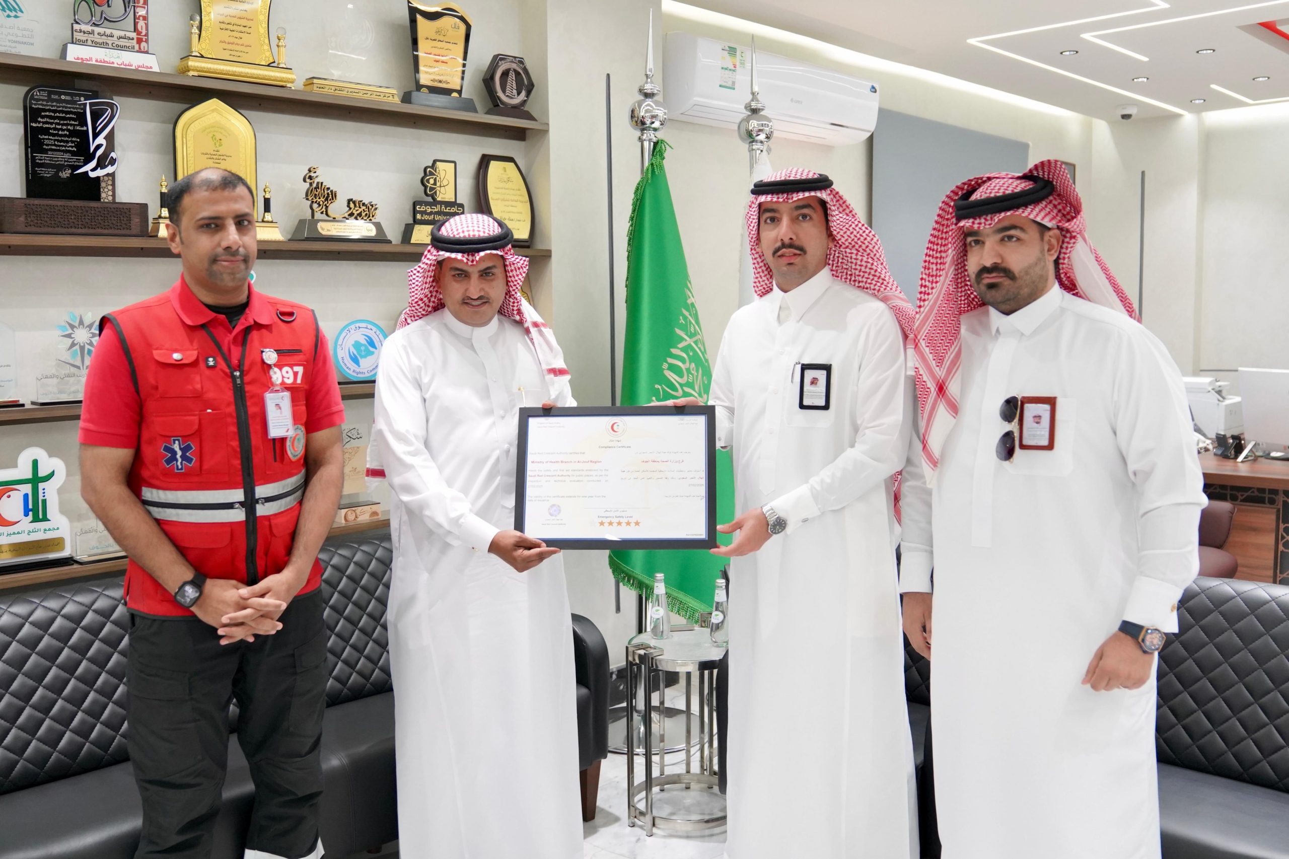 سلّم فرع هيئة الهلال الأحمر السعودي بمنطقة الجوف “شهادة امتثال” لفرع وزارة الصحة بالمنطقة، بعد استيفائه لمعايير ومتطلبات السلامة الإسعافية ضمن مشروع “معاذ” الذي يهدف إلى رفع جاهزية المنشآت الحكومية في التعامل مع الحالات الطارئة.