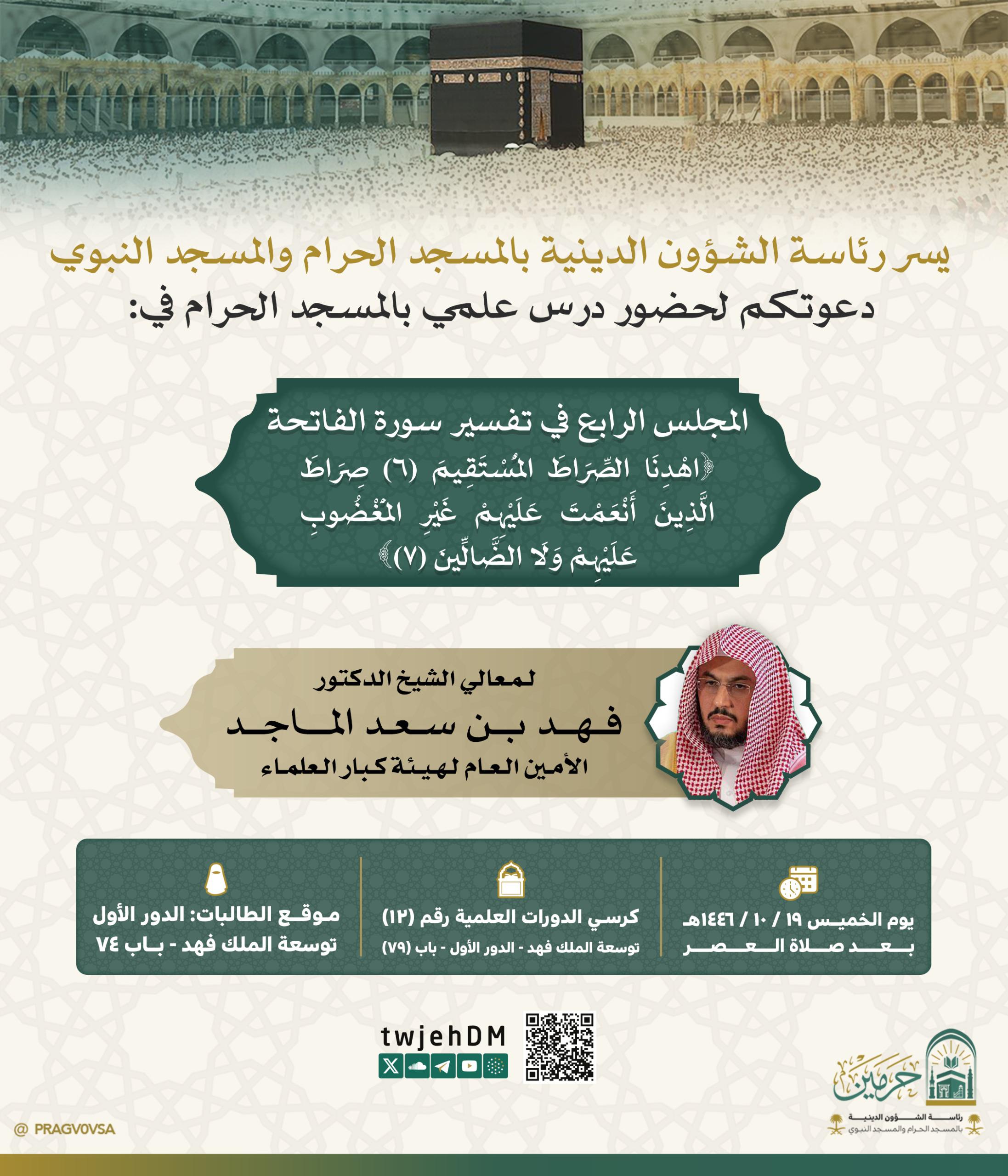 ويُلقي الدرس معالي الشيخ الدكتور فهد بن سعد الماجد، الأمين العام لهيئة كبار العلماء، وذلك يوم الخميس الموافق 19 شوال 1446هـ، بعد صلاة العصر، في رحاب المسجد الحرام.