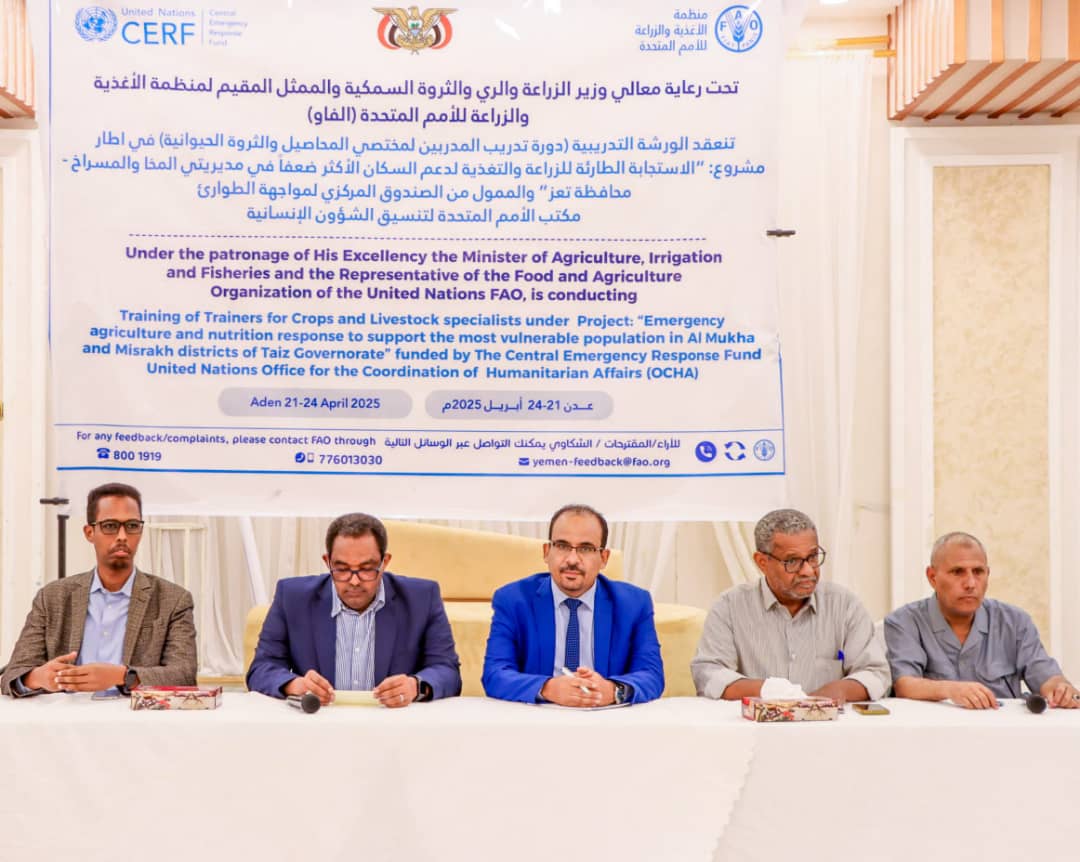 بدأت بالعاصمة المؤقتة عدن، اليوم، فعاليات ورشة تدريبية لمدربين (TOT) لمختصي المحاصيل والثروة الحيوانية، ضمن مشروع الاستجابة الطارئة للزراعة والتغذية لدعم السكان الأكثر ضعفاً في مديريتي المخا والمسراخ بمحافظة تعز، بتمويل الصندوق المركزي لمواجهة الطوارئ التابع لمكتب الأمم المتحدة لتنسيق الشؤون الإنسانية (OCHA).