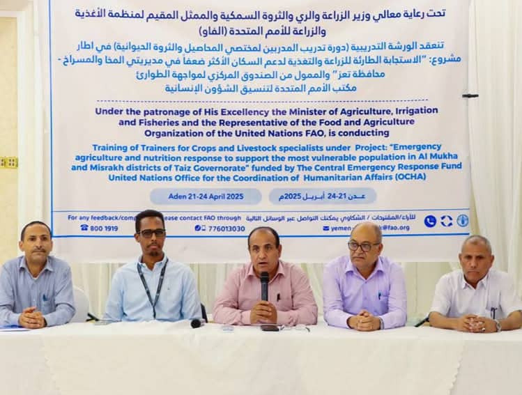 اختُتمت اليوم بعدن أعمال الورشة التدريبية الخاصة بتعزيز قدرات مختصي المحاصيل الزراعية والثروة الحيوانية، والتي أُقيمت برعاية وزير الزراعة والري والثروة السمكية، اللواء سالم عبدالله السقطري، وبالتنسيق مع منظمة الأغذية والزراعة للأمم المتحدة (الفاو)، ضمن مشروع الاستجابة الطارئة للزراعة والتغذية، والمموّل من الصندوق المركزي لمواجهة الطوارئ (CERF) التابع للأمم المتحدة، ويستهدف دعم السكان الأكثر ضعفًا في مديريتي المخا والمسراخ بمحافظة تعز.