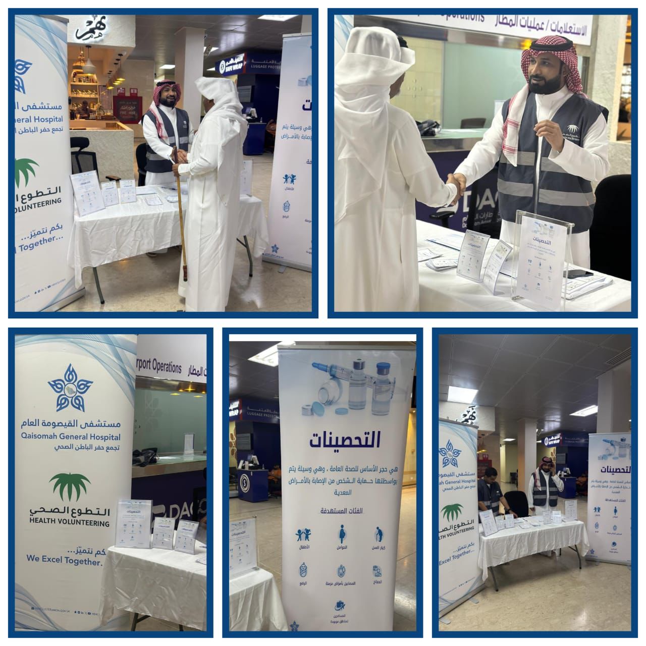 وقد أقامت المستشفى فعاليات توعوية مكثفة في مطار القيصومة الدولي على مدار خمسة أيام، ابتداءً من تاريخ 24 أبريل، وذلك بفضل الاستقبال والتعاون المشكور من إدارة المطار. استهدفت الحملة بشكل خاص كبار السن، والحوامل، والأطفال، والمصابين بالأمراض المزمنة، بالإضافة إلى الرضع، حيث تم توزيع منشورات توعوية شاملة للمسافرين.