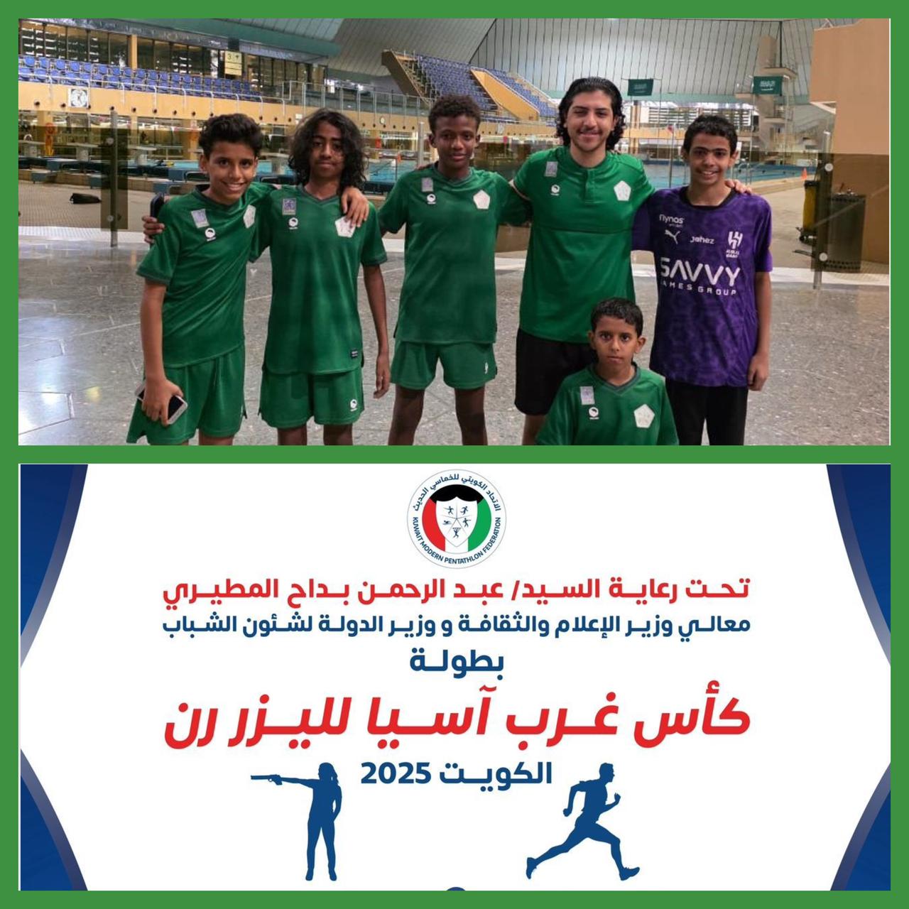 يشارك المنتخب السعودي للخماسي الحديث في بطولة اتحاد غرب اسيا لليزر رن (فردي) رجال وسيدات، برعاية عبدالرحمن المطيري وزير الإعلام والثقافة ووزير الدولة لشئون الشباب في الكويت، والتي ستقام في الكويت خلال الفترة من 30 ابريل الجاري إلى 2 مايو 2025، ضمن 7 منتخبات وهي (السعودية، الكويت، الإمارات، العراق، البحرين، سوريا، لبنان).
