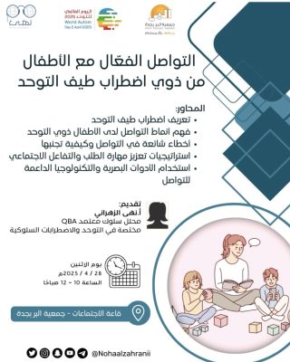 نظمت جمعية البر بجدة لقاء توعوياً للأسر المستفيدة المسجلة في الجمعية حول “التواصل الفعال مع ذوي اضطراب طيف التوحد”، قدّمته أ. نهى الزهراني (محلل سلوك معتمد)، مختصة بالتوحد والاضطرابات السلوكية.