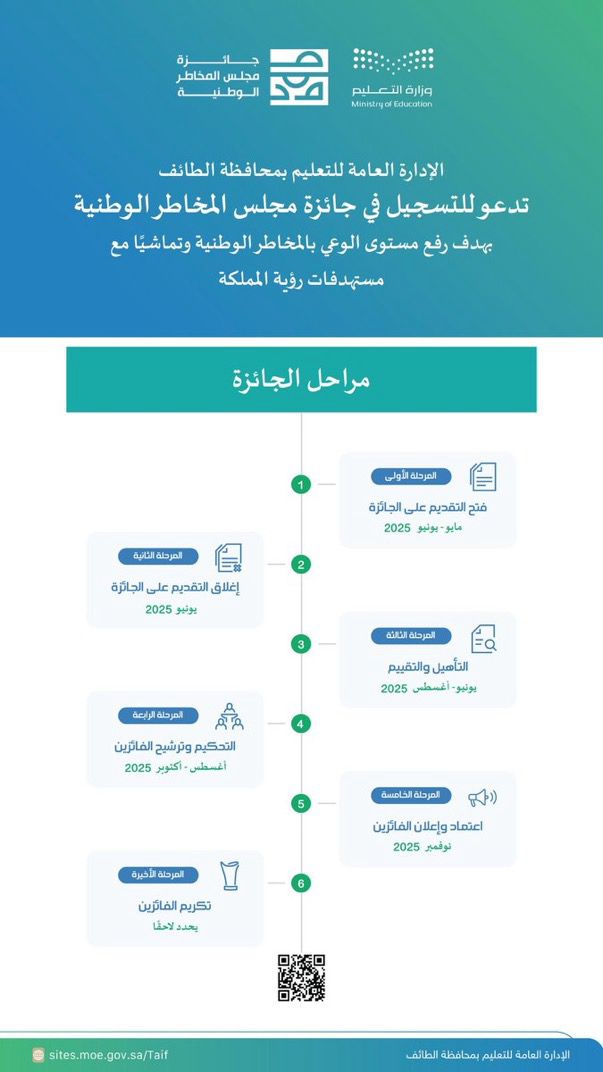 دعت الإدارة العامة للتعليم في محافظة الطائف منسوبيها إلى التسجيل في الدورة الثانية من جائزة مجلس المخاطر الوطنية التي يقدمها مجلس المخاطر الوطنية وتنطلق في الرابع من مايو القادم عبر موقع الجائزة الإلكتروني.