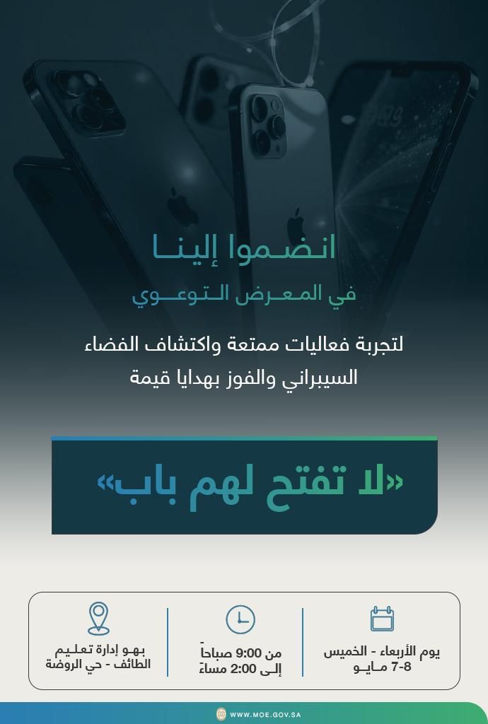 تستضيف الإدارة العامة للتعليم بمحافظة الطائف معرض التوعية بالأمن السيبراني الذي تنظمه وزارة التعليم تحت عنوان: “لا تفتح لهم باب” في محطته السابعة وذلك يومي الأربعاء والخميس 7-8 مايو بمبنى الإدارة بالحلقة.