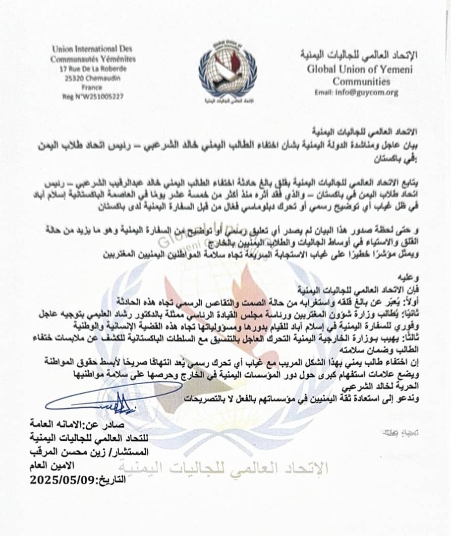 أعرب الاتحاد العالمي للجاليات اليمنية عن قلقه البالغ إزاء حادثة اختفاء رئيس اتحاد طلاب اليمن في باكستان الطالب خالد عبدالله الشرعبي، والذي فُقدت آثاره منذ عدة أيام في العاصمة الباكستانية إسلام أباد، دون أي تحرك رسمي من الجهات اليمنية المختصة.