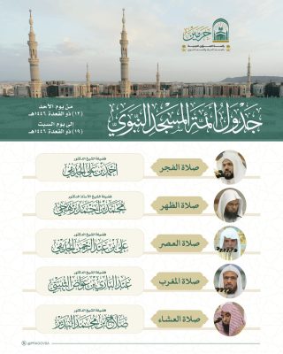 أعلنت رئاسة الشؤون الدينية بالمسجد الحرام والمسجد النبوي عن الجدول الأسبوعي لأئمة الحرمين الشريفين للفترة من يوم الأحد ١٣ ذي القعدة وحتى يوم السبت ١٩ ذي القعدة ١٤٤٦هـ، وذلك في إطار حرصها على تنظيم الشعائر، وتمكين المصلين من أداء صلواتهم في أجواء من السكينة والخشوع