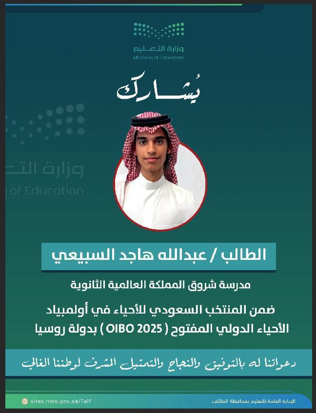 يشارك الطالب عبدالله هاجد السبيعي من الإدارة العامة للتعليم في الطائف ضمن المنتخب السعودي للأحياء في أولمبياد الأحياء الدولي المفتوح( OIBO2025 )، بدولة روسيا،