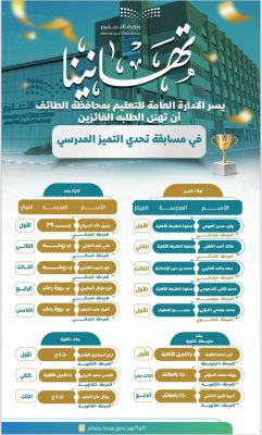 ويُعد برنامج “تحدي التميز المدرسي” أحد المبادرات النوعية التي أطلقتها الإدارة بهدف ترسيخ ثقافة التميز والإبداع في المجتمع التعليمي، وتحفيز الطلبة على تطوير مهاراتهم وصقل قدراتهم، بما يتماشى مع مستهدفات رؤية المملكة 2030.
