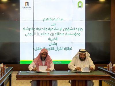 مذكرة تفاهم نوعية مع مؤسسة عبدالله بن عبدالعزيز الراجحي الخيرية تهدف إلى تعزيز التعاون في مجالات العناية بكتاب الله وتنشئة الأجيال الناشئة على حب القرآن الكريم وتدبره، وذلك من خلال إطلاق “جائزة القرآن الكريم للطفل” وتفعيل برامج نوعية تهتم بتأهيل وتكريم الموهوبين من الأطفال في هذا المجال.