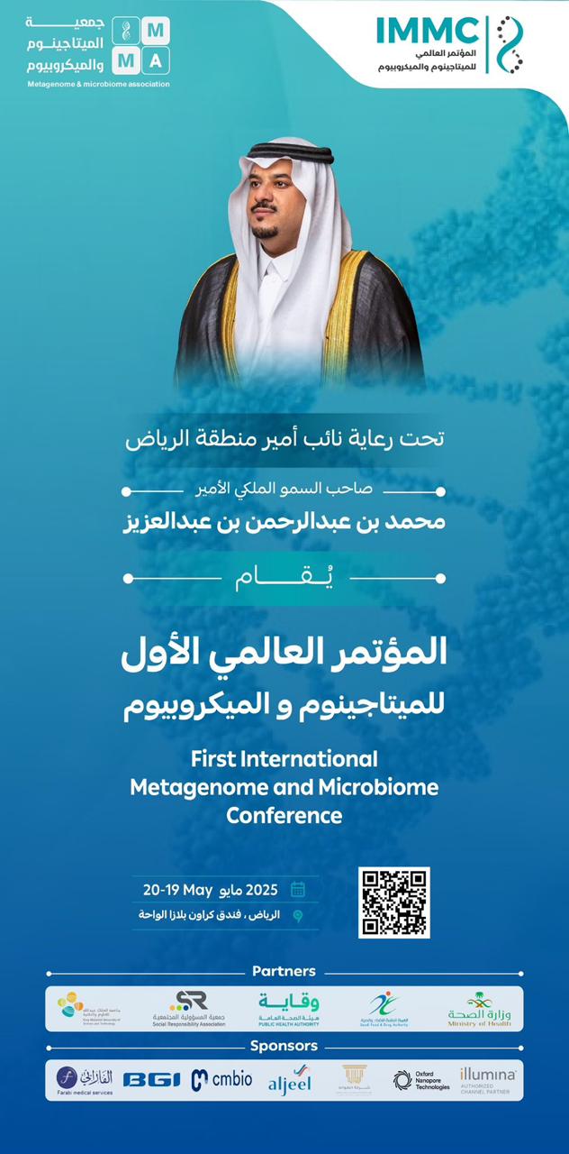 تحت رعاية كريمة من صاحب السمو الملكي الأمير محمد بن عبدالرحمن بن عبدالعزيز نائب أمير منطقة الرياض، تستعد جمعية الميتاجينوم والميكروبيوم يومي 19-20 مايو القادم إطلاق المؤتمر السعودي الأول من نوعه في هذا المجال العلمي المتقدم، والذي يجمع نخبة من الباحثين والمتخصصين من داخل المملكة وخارجها، بهدف تسليط الضوء على أحدث تقنيات الجينوم والميكروبيوم وتطبيقاتها في مجالات الصحة والبيئة.
