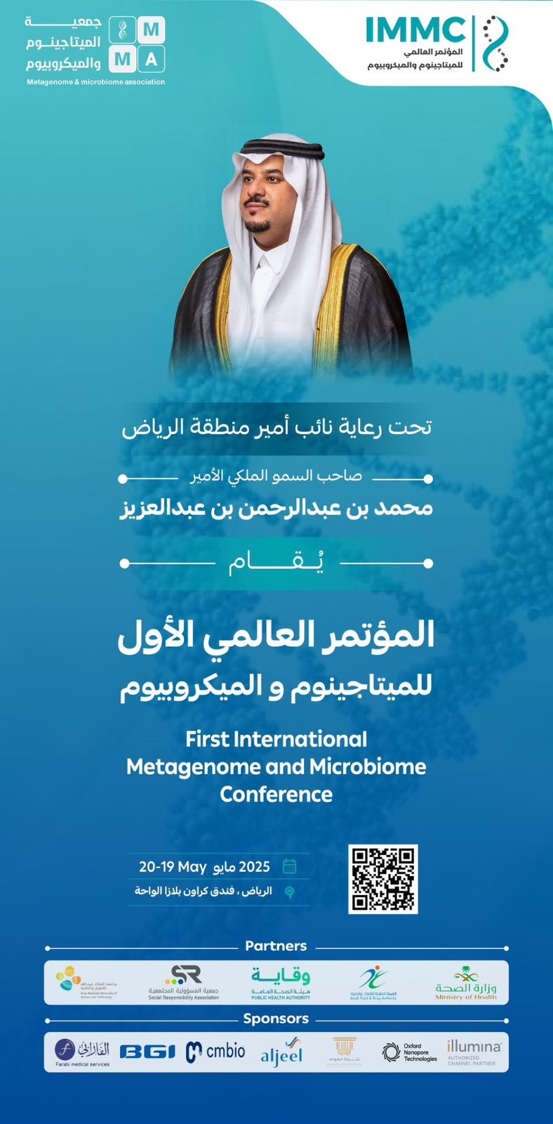 تنطلق صباح غدٍ الإثنين في العاصمة الرياض فعاليات المؤتمر العالمي الأول للميتابيوم والميكروبيوم، برعاية كريمة من صاحب السمو الملكي الأمير محمد بن عبدالرحمن بن عبدالعزيز آل سعود، نائب أمير منطقة الرياض.