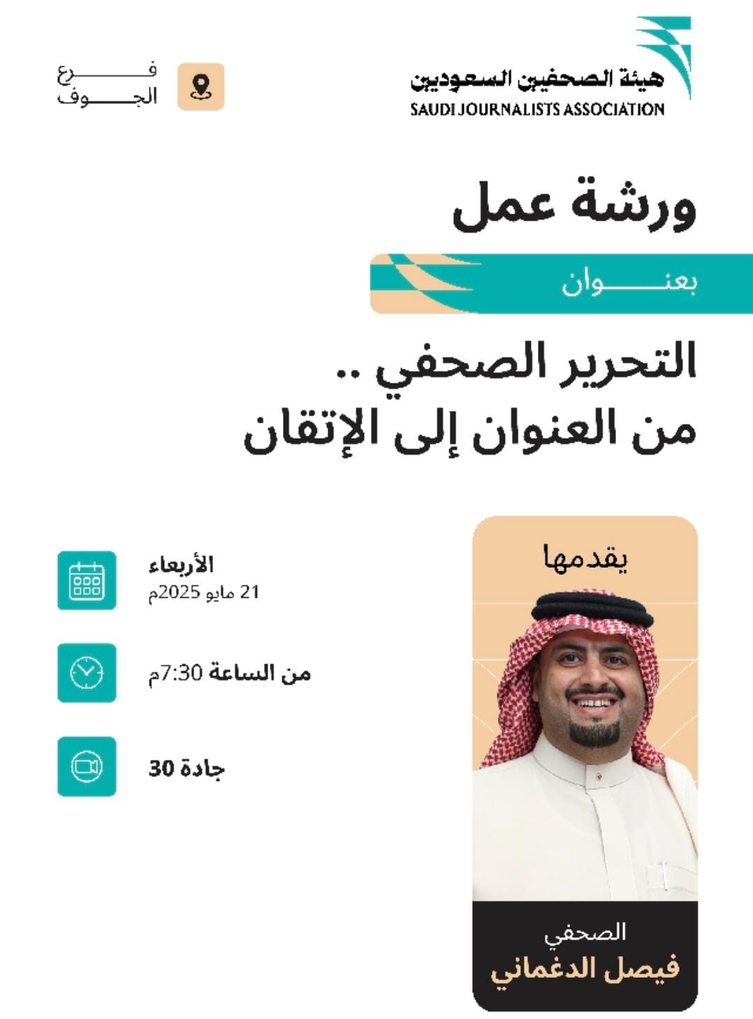 يعلن فرع هيئة الصحفيين السعوديين بمنطقة الجوف عن إقامة ورشة عمل متخصصة بعنوان “التحرير الصحفي .. من العنوان إلى الإتقان”.