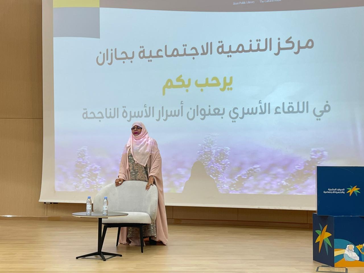 نفذ مركز التنمية الإجتماعية بجازان بالتعاون مع مركز عين اليقين للإرشاد النفسي والأسري مساء الليلة اللقاء الأسري بعنوان أسرار الأسرة الناجحة قدمته الدكتورة زهرة سعد المعبي برعاية سعادة مساعد المدير العام للتنمية الاستاذة فوزيه عبده باصهي وبحضور مدير مركز التنمية بجازان الأستاذ أحمد قاسم عزيز.