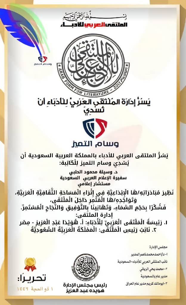 يسرني مشاركتكم تكريمي بوسام التميز من الملتقى العربي للأدباء ، حيث تم تكريمي مساء امس الأول من ذي الحجة ..وذلك نظير مشاركاتي الأدبية والإبداعية في إثراء الساحة الثقافية العربية ، وتواجدي كعضو مميز في الملتقى العربي للأدباء في السعودية .