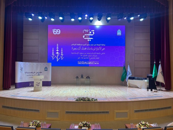 برعاية حرم صاحب السمو الملكي أمير منطقة الرياض سمو الأميرة نورة بنت محمد بن سعود آل سعود احتفت جامعة الإمام محمد بن سعود الإسلامية مساء اليوم الخميس 2025/5/29 م بتخريج الدفعة (69) من طالباتها وتكريم الحاصلات على التميز من مختلف الدرجات العلمية بمختلف الأقسام والكليات، وذلك في قاعة المؤتمرات بمدينة الملك عبدالله للطالبات.