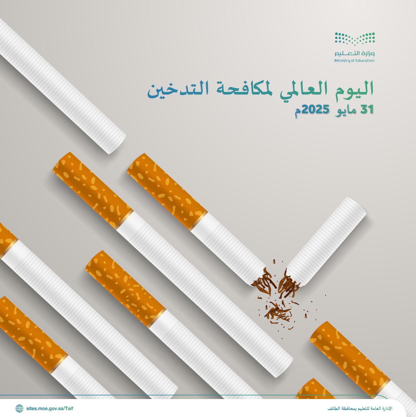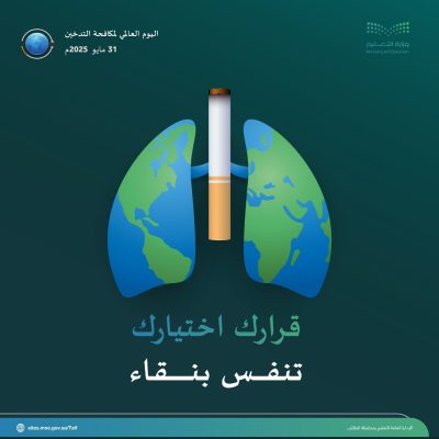 تشارك الإدارة العامة للتعليم في الطائف في اليوم العالمي لمكافحة التدخين، الذي يصادف اليوم السبت 31 مايو من كل عام، حيث أطلقت رسائل توعوية عبر حساباتها الرسمية للتوعية بأضرار التدخين على الطلاب والطالبات والمجتمع وأولياء الأمور من أضرار التدخين والمشكلات والآثار السلبية المترتبة عليه،