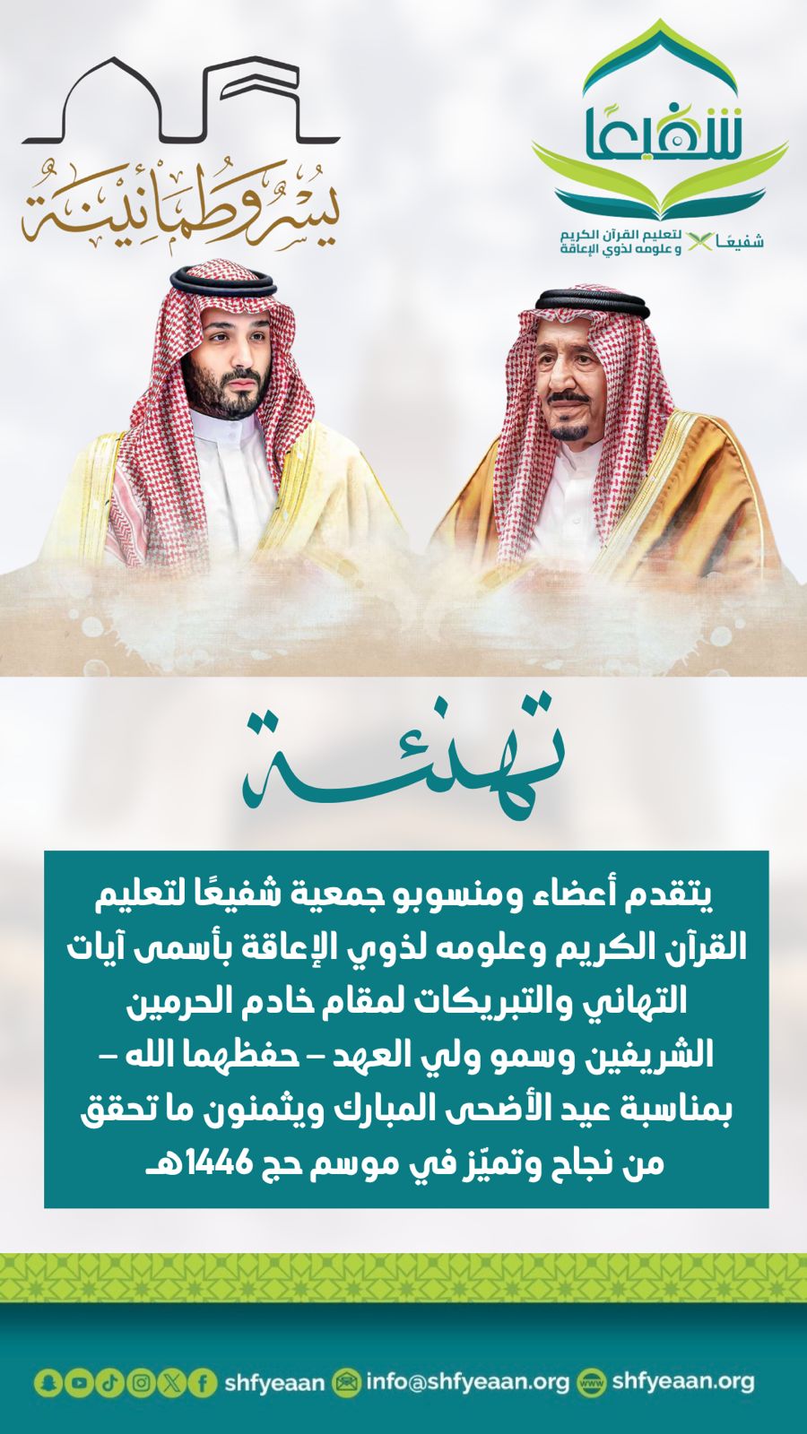 يرفع أعضاء ومنسوبو جمعية شفيعًا لتعليم القرآن الكريم وعلومه لذوي الإعاقة أسمى آيات التهاني والتبريكات إلى خادم الحرمين الشريفين الملك سلمان بن عبدالعزيز آل سعود، وإلى سمو ولي العهد الأمير محمد بن سلمان بن عبدالعزيز آل سعود – حفظهما الله – بمناسبة حلول عيد الأضحى المبارك، سائلين الله تعالى أن يعيده على المملكة قيادةً وشعبًا بالخير واليُمن والبركات، وعلى الأمتين العربية والإسلامية بالأمن والاستقرار والنصر المبين.