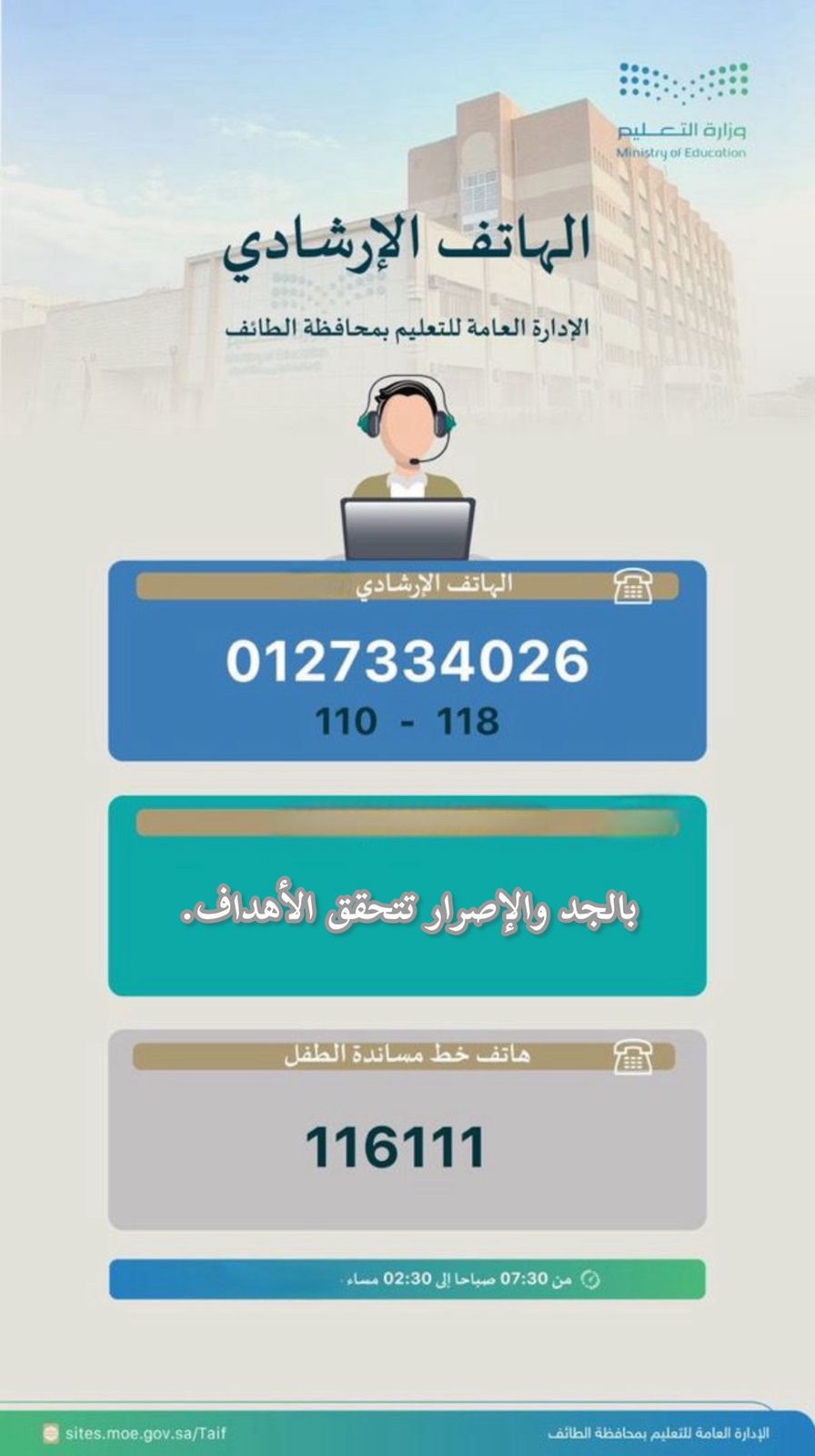 أطلقت الإدارة العامة للتعليم بالطائف خدمة الهاتف الإرشادي والاستشاري للطلبة وأولياء الأمور “بنين” و”بنات” لتقديم الاستشارات التربوية والنفسية والاجتماعية وذلك حتى خلال فترة اختبارات نهاية الفصل الدراسي الثالث من العام الدراسي الحالي 1446هـ