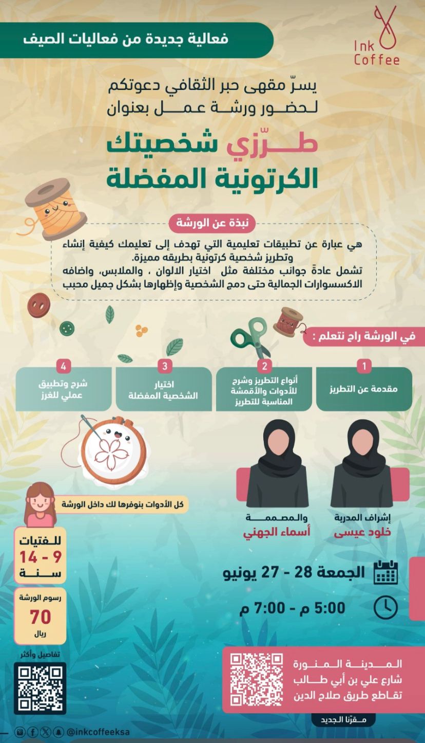 استمرارًا في تقديم فعاليات صيفية تثري الخيال والإبداع لدى النشء، يسرّ مقهى حبر الثقافي الإعلان عن إقامة ورشة عمل مميزة تحت عنوان “طرزي شخصيتك الكرتونية المفضلة” والمخصصة للفتيات من عمر 9 إلى 14 سنة، وذلك يومي الجمعة والسبت، 27 و28 يونيو 2025من الساعة 5:00 حتى 7:00 مساءً في مقر المقهى الجديد