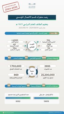استعرضت الإدارة العامة للتعليم في محافظة الطائف منجزاتها خلال العام 1446هـ، بهدف تعزيز الأدوار التكاملية والفهم المشترك بين الإدارات والأقسام والوحدات في الإدارة ، والارتقاء بمستوى الأداء وجودته. وتعمل الإدارة على إبراز الجهود عبر موقعها الرسمي