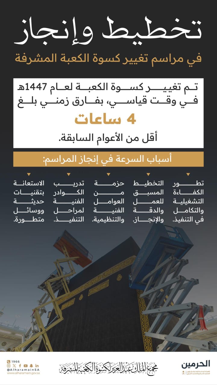 أتمّت الهيئة العامة للعناية بشؤون المسجد الحرام والمسجد النبوي مراسم استبدال كسوة الكعبة المشرفة لهذا العام 1447هـ في وقتٍ قياسي؛حيث بدأت أعمال التغيير في تمام الساعة 12:00 منتصف ليل الخميس، غرة شهر الله المحرم، وانتهت في تمام الساعة 6:40 صباحًا من اليوم ذاته، محققة بذلك فارق عمل بلغ 4 ساعات عن المدة المعتادة في الأعوام السابقة.