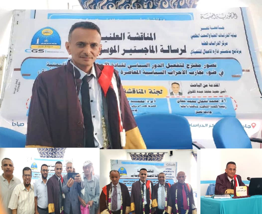 وبعد مناقشة علمية مستفيضة، أشادت اللجنة بمنهجية الباحث أمين حميد محمد عبده المشولي، وأسلوبه التحليلي المقارن، وأوصت بمنحه درجة الماجستير بتقدير امتياز، مع التوصية بطباعة الرسالة وتعميمها على الجهات ذات العلاقة لما تحمله من رؤى علمية ومقترحات قابلة للتطبيق في الواقع السياسي اليمني.