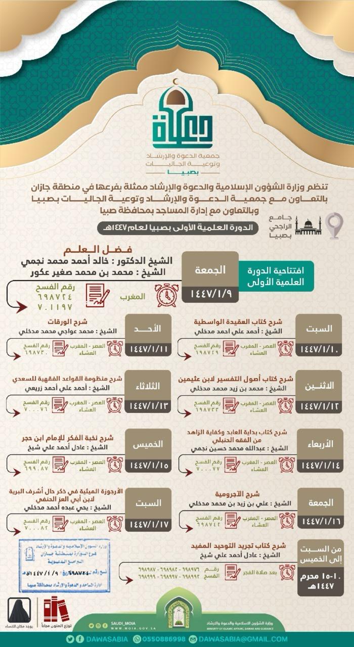أطلقت جمعية الدعوة والإرشاد وتوعية الجاليات بمحافظة صبيا مساء اليوم، فعاليات الدورة العلمية الأولى لعام 1447هـ، وسط حضور جمع من طلاب العلم والمهتمين، وذلك في جامع الراجحي بالمحافظة.