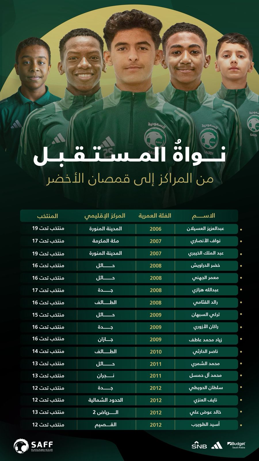 كما قدم المركز الإقليمي في جدة لمنتخبات الفئات السنية 3 لاعبين هم عبدالله هزازي “منتخب تحت 17 عامًا”، راكان الأزوري “منتخب تحت 16 عامًا” وسلطان بن عبدالله الحويطي “منتخب تحت 12 عامًا”، فيما قدم المركز الإقليمي في مكة المكرمة اللاعب نواف الأنصاري الذي انضم لمنتخب تحت 17 عامًا.