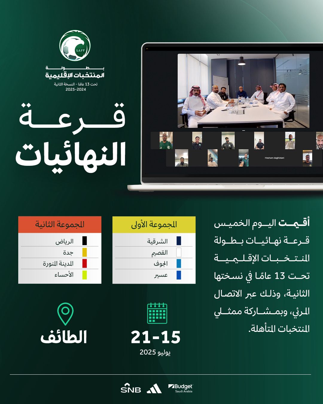 أُجريت اليوم الخميس قرعة بطولة المنتخبات الإقليمية تحت 13 عامًا في نسختها الثانية، بحضور المدير الفني للاتحاد السعودي ناصر لارغيت ومدير المنتخب الأول صالح الداود ومدير إدارة البراعم ومراكز التدريب الإقليمية أحمد البحراني