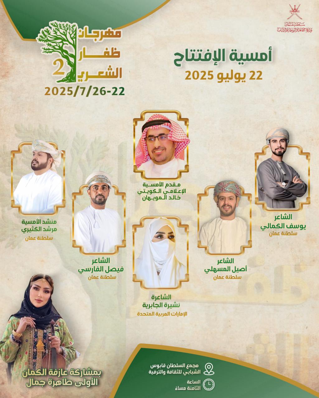 ينطلق الثلاثاء القادم الثاني والعشرين من الشهر الجاري مهرجان ظفار الشعري الثاني الذي ينظمه صالون مجان الأدبي تحت شعار “ياحي بكم ” وسيقام حفل الافتتاح بمجمع السلطان قابوس الشبابي للثقافة والترفيه وتقام الامسيات بمواقع مختلفة منها قاعة الاستاذ بمكتبة دار الكتاب بصلالة ومسرحح عودة الماضي وتستمر فعاليات المهرجان خمسة أيام .