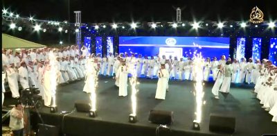ثم شاهد حضور الحفل عرضاً مرئياً استعرض مسيرة مبادرة الزواج الجماعي كمنهج حياة بدأت حكايته – التي نسجت مجداً اجتماعياً – منذ العام 1437 هـ.