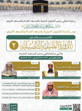 أعلنت رئاسة الشؤون الدينية بالمسجد الحرام والمسجد النبوي عن إقامة الدورة الصيفية التأصيلية الثانية لعام 1447هـ، والتي تُعقد في رحاب المسجد الحرام بمكة المكرمة، خلال الفترة من 26 محرم حتى نهاية 20 صفر 1447هـ.