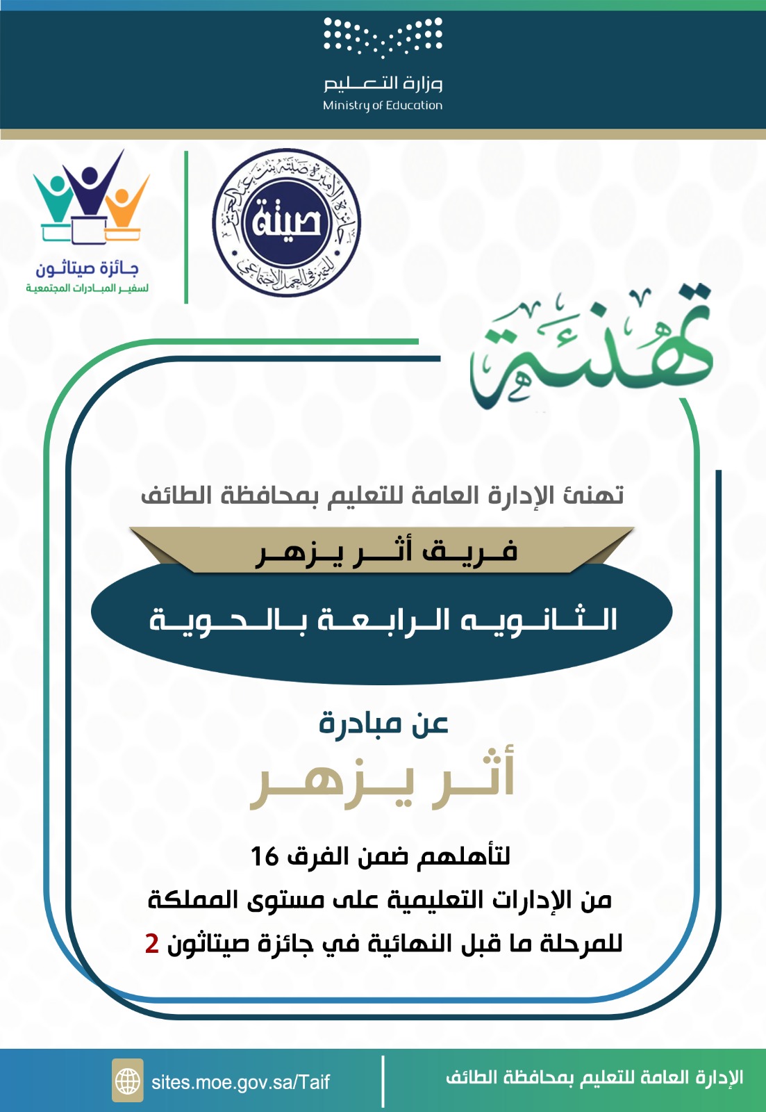 تأهلت الثانوية الرابعة في الإدارة العامة للتعليم في الطائف ضمن أفضل 16 فريقًا على مستوى المملكة للمرحلة ماقبل النهائية في جائزة صيتاثون 2 ،لتأهلهم إلى مرحلة التصفية ما قبل النهائية في جائزة الأميرة صيتة للتميّز، بمبادرة “أثر يزهر”