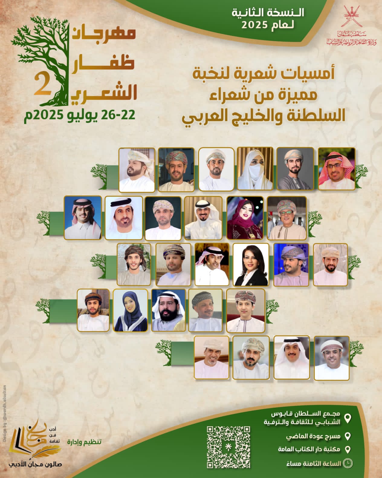 وقد أعلنت الشاعرة هناء سليم رئيسة صالون مجان الأدبي ورئيسة مهرجان ظفار الشعري الثاني عن قائمة الشعراء والإعلاميين المشاركين في أمسيات المهرجان، بالإضافة إلى تفاصيل جدول الفعاليات الشعريّة، والتي ستُقام في محافظة ظفار خلال الفترة من 22 يوليو حتى 26 يوليو 2025، تحت شعار “يا حي بكم”، بمشاركة نخبة من الأسماء الشعرية والإعلامية الخليجية المميزة.
