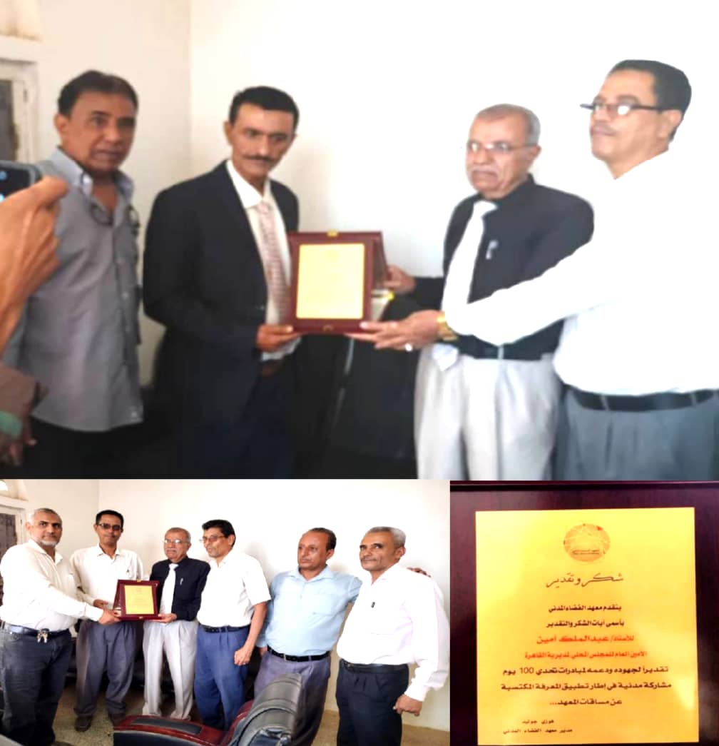 كرّم معهد الفضاء المدني، اليوم، أمين عام المجلس المحلي في مديرية القاهرة بمحافظة تعز الأستاذ عبدالملك أمين، تقديرًا لجهوده المتميزة ودعمه الفاعل لمبادرات “تحدي 100 يوم مشاركة مدنية”، المنفذة ضمن برنامج تطبيق المعرفة المكتسبة من مساقات المعهد.