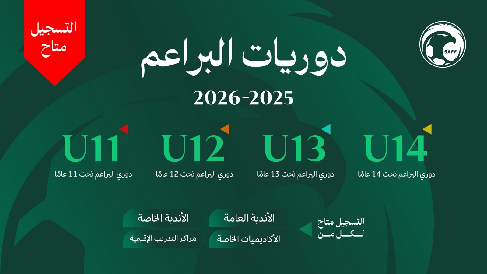 أعلن الاتحاد السعودي لكرة القدم فتح التسجيل للأندية العامة والخاصة والأكاديميات الخاصة ومراكز التدريب الإقليمية، في دوريات البراعم للفئات العُمرية مواليد 2011 فما فوق، لفئات تحت 11، 12, 13, 14 عامًا للموسم الرياضي الجديد 2025 ـ 2026.