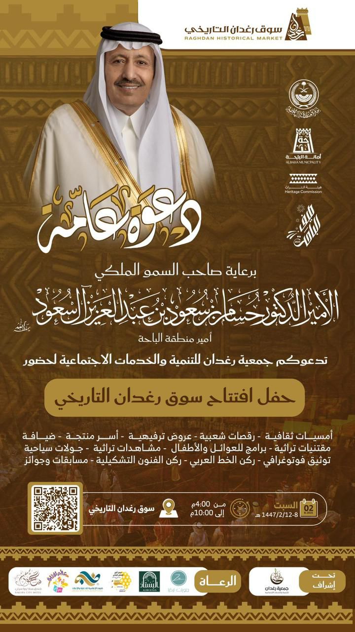 برعاية صاحب السمو الملكي الأمير الدكتور حسام بن سعود بن عبدالعزيز أمير منطقة الباحة ، تدعوكم جمعية رغدان للتنمية والخدمات الاجتماعية لحضور حفل افتتاح سوق رغدان التاريخي السبت الموافق 8 صفر .