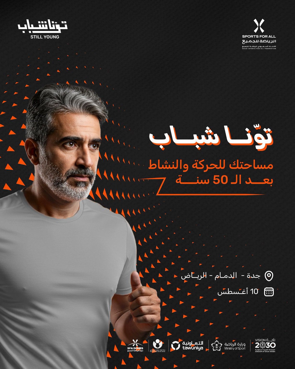 ﻳّﻌﻠن الاتحاد السعودي للرياضة للجميع ﻋﻦ اﻧﻄﻼق اﻟﻨﺴﺨﺔ اﻷوﻟﻰ ﻣﻦ اﻟﺒﺮﻧﺎﻣﺞ اﻟﺮﻳﺎﺿﻲ اﻟﻨﻮﻋﻲ #ﺗﻮﻧﺎ_ﺷﺒﺎب اﻟﻤﺨﺼﺺ ﻟﻔﺌﺔ ﻛﺒﺎر اﻟﺴﻦ +50 عاماً ، واﻟﺬي ﻳﺴﺘﻤﺮ ﻟﻤﺪة 6 أﺷﻬﺮ ﻓﻲ ﺛﻼث ﻣﺪن رﺋﻴﺴﻴﺔ، اﻟﺮﻳﺎض، ﺟﺪة، واﻟﺪﻣﺎم، ﺑﺈﺷﺮاف ﻣﺪرﺑﻴﻦ ﻣﻌﺘﻤﺪﻳﻦ وﻣﺘﺨﺼﺼﻴﻦ ﺑﺘﺪرﻳﺐ ﻛﺒﺎر اﻟﺴﻦ.