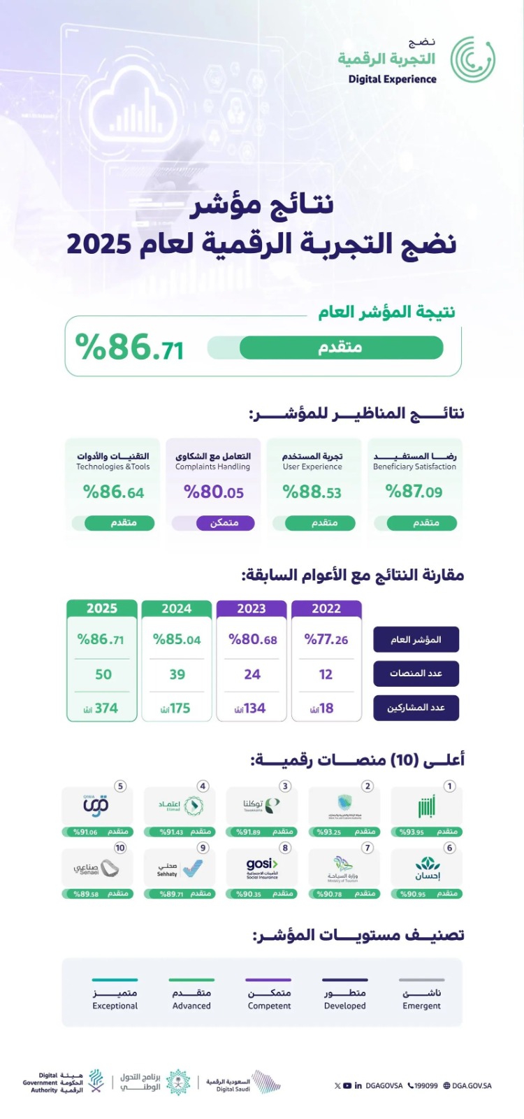 أعلنت هيئة الحكومة الرقمية عن تحقيق نتائج استثنائية لمؤشر نضج التجربة الرقمية لعام 2025، حيث وصل المؤشر إلى نسبة 86.71% بمستوى “متقدم”، في إنجاز جديد يعكس التحول الرقمي المتسارع الذي تشهده المملكة. وشمل التقييم 50 منصة رقمية حكومية عبر 20 محورًا رئيسيًا، تضمنت رضا المستفيدين وتجربة المستخدم والتعامل مع الشكاوى، إضافة إلى تقنيات وأدوات حديثة، لتقديم تجربة رقمية متكاملة تلبي تطلعات المواطن والمقيم على حد سواء.
