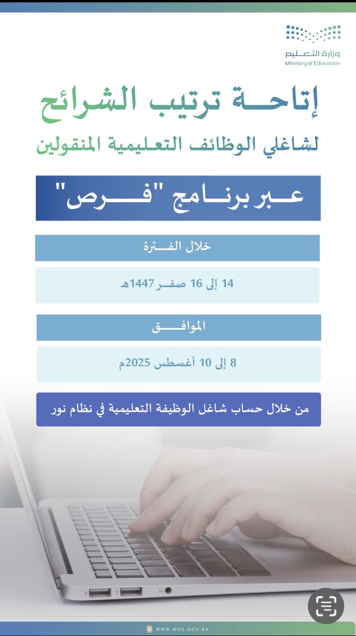 أعلنت الإدارة العامة للتعليم بمحافظة الطائف عبر موقعها في منصة x إتاحة ترتيب الشرائح لشاغلي الوظائف التعليمية المنقولين عبر برنامج “فرص” من خلال حساب شاغل الوظيفة التعليمية في نظام نور خلال الفترة من 14 إلى 16 صفر 1447هـ.