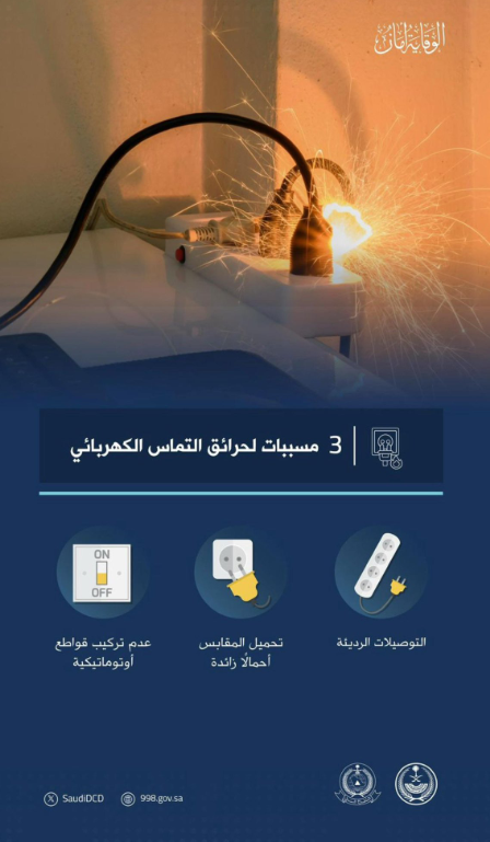 وعزا الدفاع المدني وقوع هذه الحوادث لثلاثة أسباب هي التوصيلات الرديئة، وتحميل المقابس أحمالًا زائدة، وعدم تركيب قواطع أوتوماتيكية.