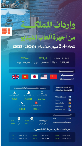 سجّل قطاع الألعاب الإلكترونية في المملكة نموًا ملحوظًا خلال العامين الماضيين، حيث بلغ حجم واردات أجهزة ألعاب الفيديو خلال عامي (2024م و2025م), ما مجموعه (2,429,524) جهازًا، وفقًا لبيانات صادرة عن هيئة الزكاة والضريبة والجمارك (زاتكا).