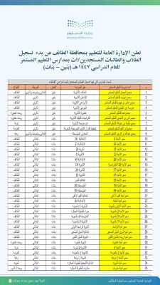 أعلنت الإدارة العامة للتعليم بالطائف عن بدء استقبال تسجيل الطلاب والطالبات الراغبين في الالتحاق بمدارس التعليم المستمر للعام الدراسي 1447هـ ( بنين ، بنات ) ، استعداداً للعام الدراسي الجديد